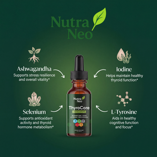 Fast-absorbing drops with Ashwagandha, Selenium, Zinc, Iodine, and L-Tyrosine to support metabolism, energy, and mental clarity daily.
